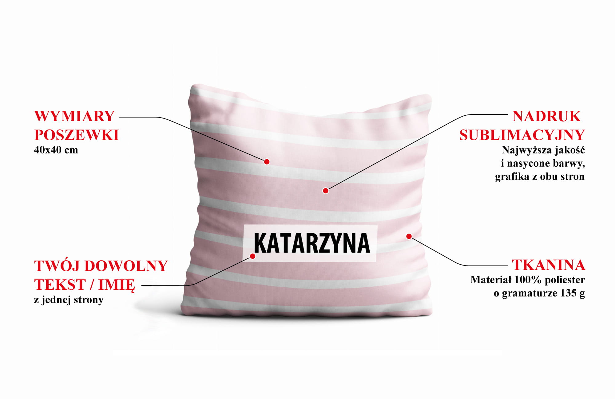 Poduszka z indywidualnym napisem, wykonane z wysokiej jakości poliestru i zadrukowane w pełnym kolorze.
