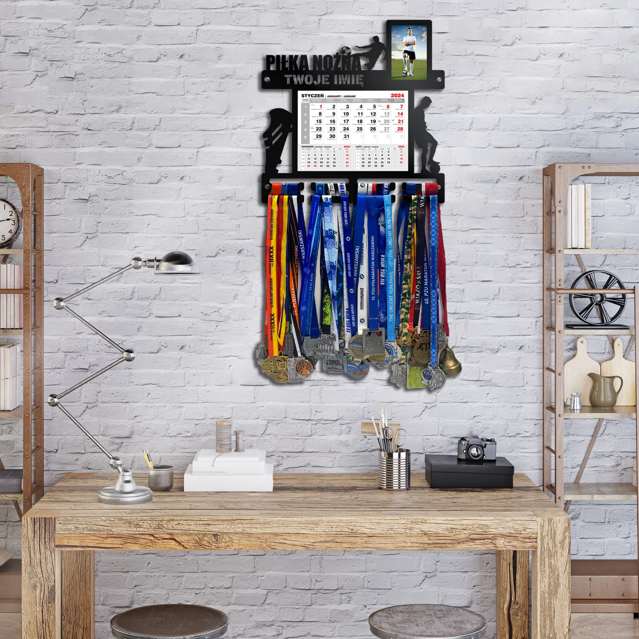 Wieszak na medale PIŁKA NOŻNA z kalendarzem i ramką na zdjęcie imię 386.1