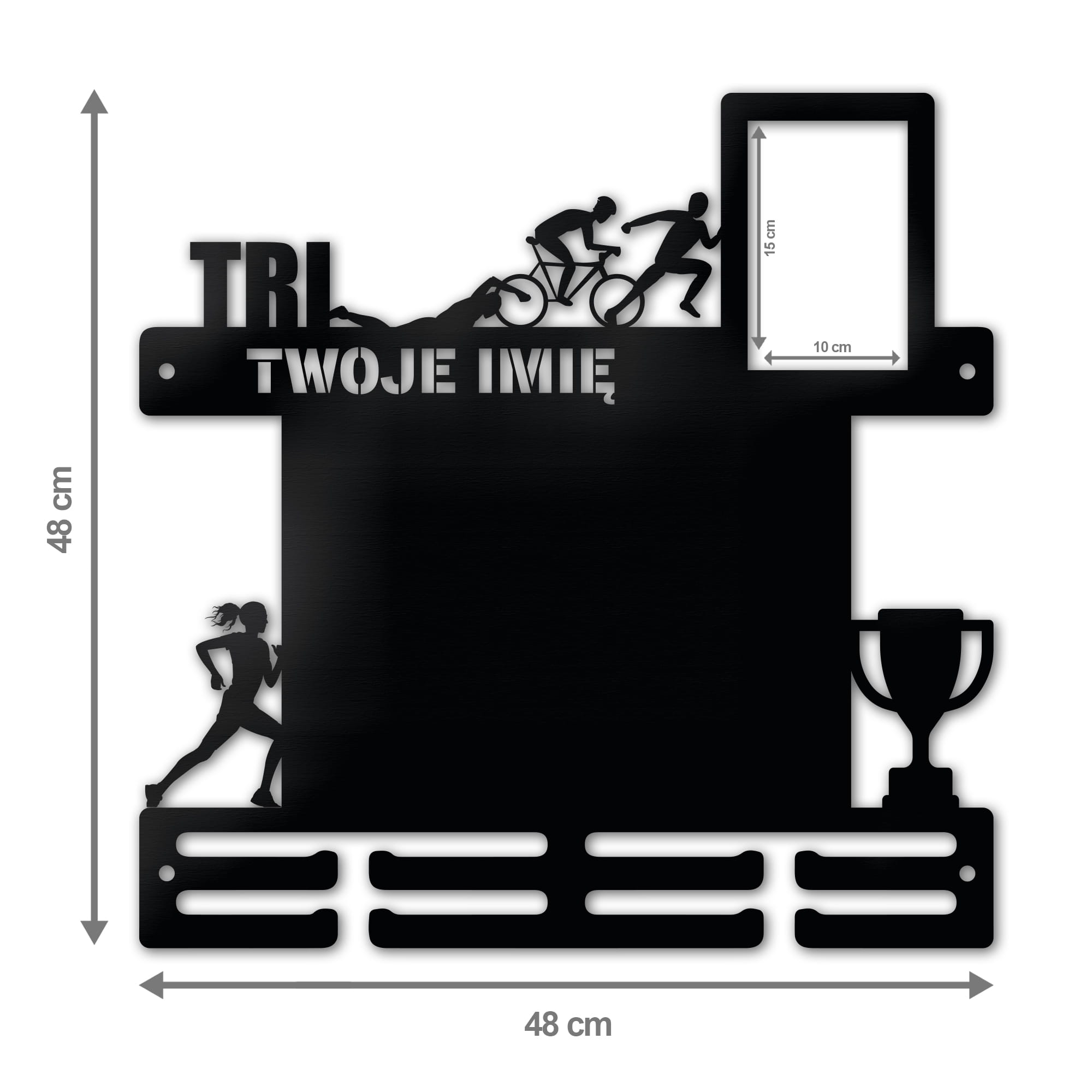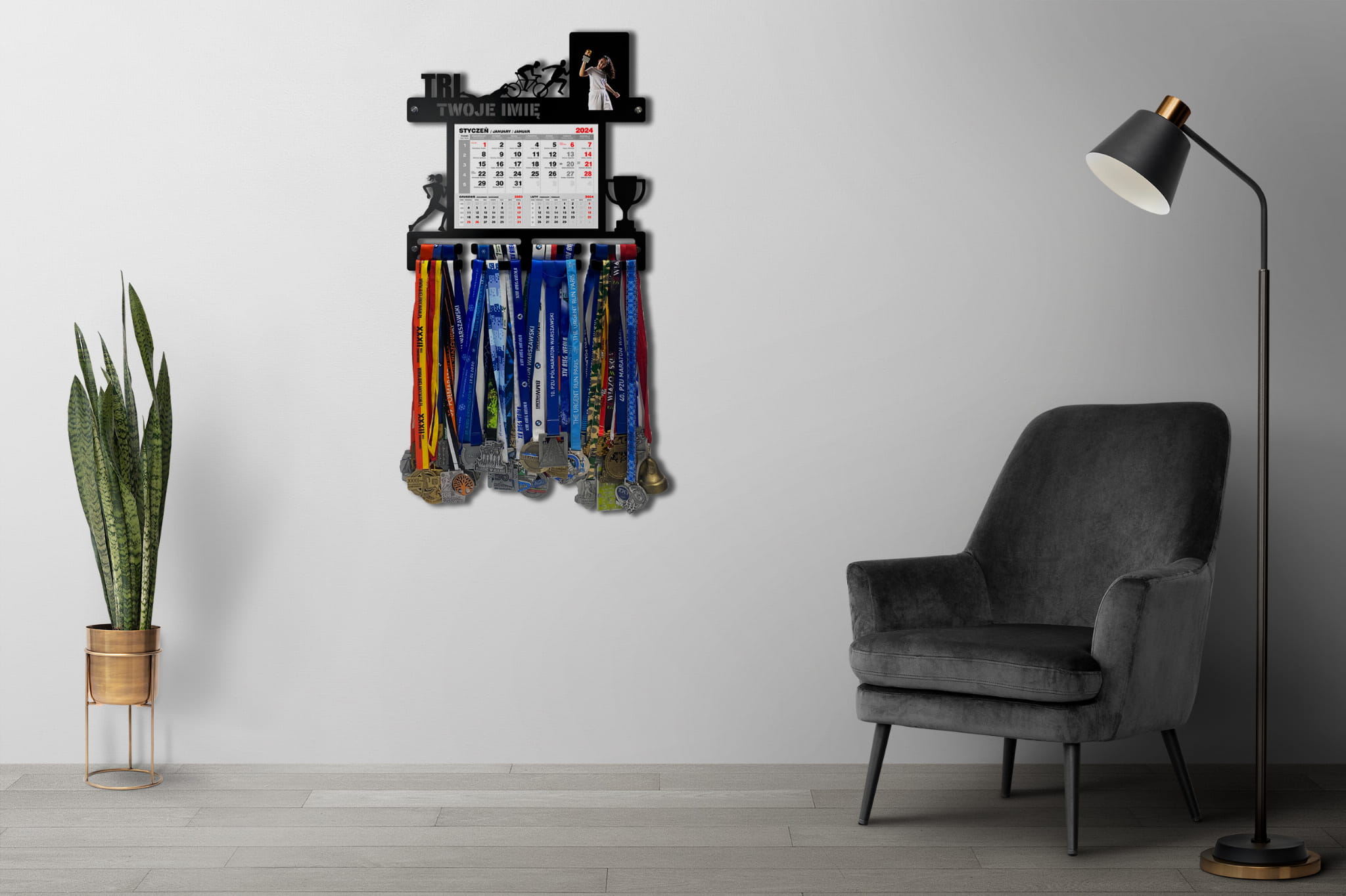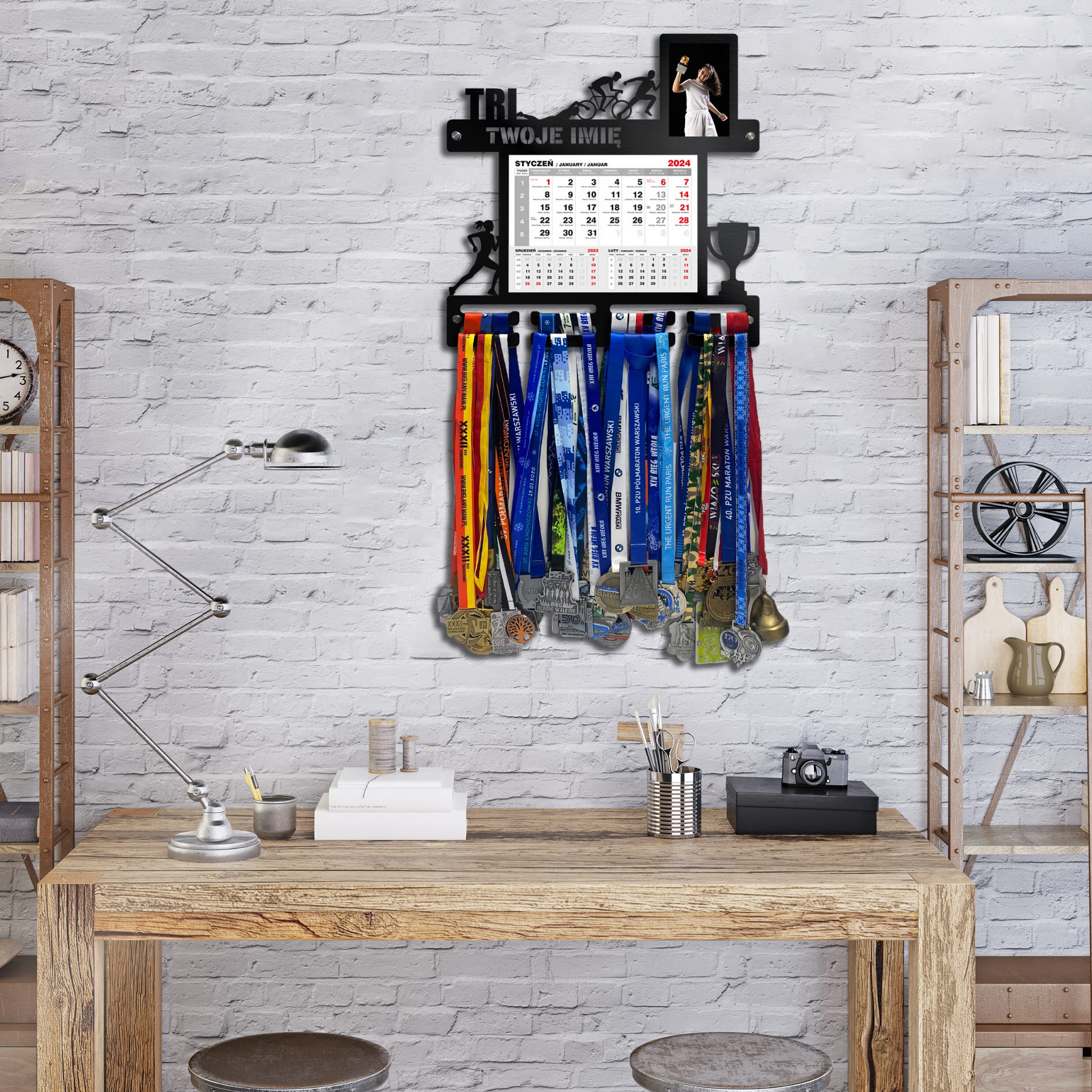 Wieszak na medale TRI WOMAN z kalendarzem i ramką na zdjęcie twoje imię dowolny tekst 414.1