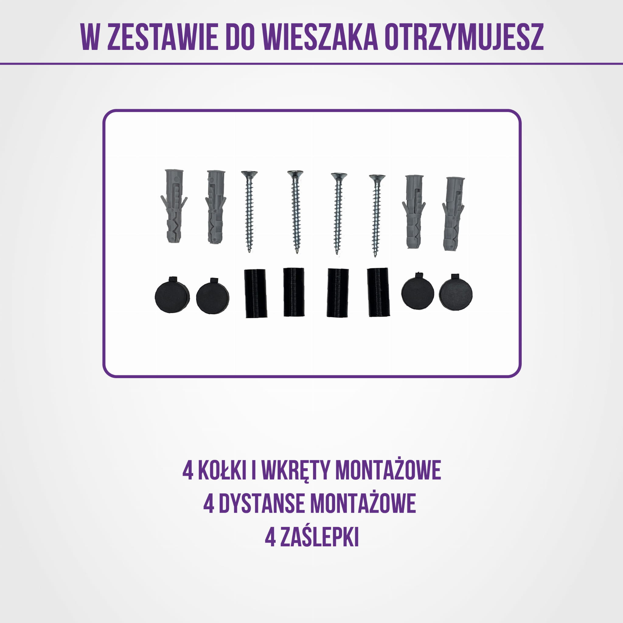 - Zestaw montażowy (kołki, wkręty, dystanse, zaślepki)